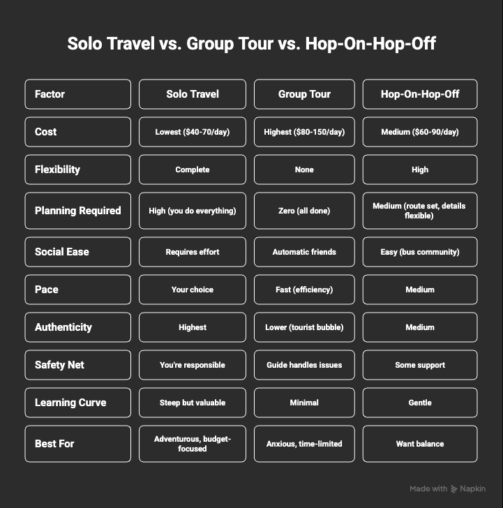 For most nervous first-timers, start with pure solo travel in Thailand—the infrastructure is so good that group tours are overkill, and you’ll build actual confidence through experience. However, if social anxiety is your #1 concern and budget allows, consider a compromise: book a 5-7 day group tour (Intrepid, G Adventures) for Week 1 as a warm-up, then go solo with your newfound skills for Week 2+. Group tours cost 2-3x more than solo travel ($80-150/day vs $50-70/day) but provide instant friends and zero planning stress.